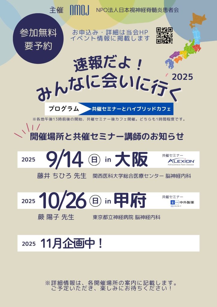 2025年も、みんなに会いに行きます!2025年9月14日(日)in 大阪 共催セミナー アレクシオンファーマ合同会社藤井 ちひろ先生 関西医科大学総合医療センター 脳神経内科2025年10月26日(日)in 甲府共催セミナー 中外製薬株式会社蕨 陽子先生 東京都立神経病院 脳神経内科2025年11月 企画中!お楽しみに!!*詳細情報は今しばらくお待ちくださいね。ご予定いただき、楽しみにお待ちください〜〜