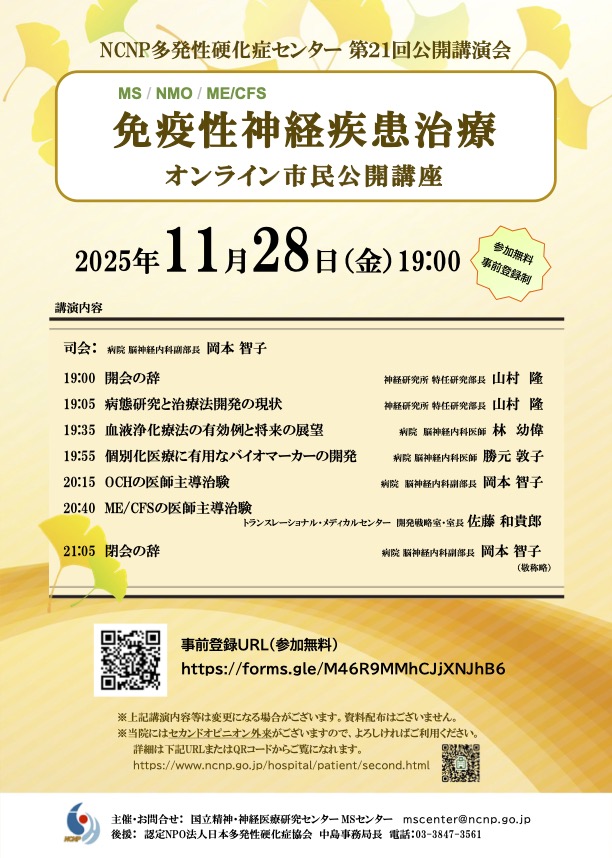 【オンライン市民公開講座のご案内】免疫性神経疾患治療 〜MS / NMO / ME/CFS〜国立精神・神経医療研究センター(NCNP)多発性硬化症センターによる第21回 公開講演会が開催されます免疫が関わる神経疾患(MS・NMO・ME/CFS)について、専門の先生方がお話しされます。日時:2025年11月28日(金)19:00〜方法:オンライン開催(参加無料・事前登録制) 参加登録はコチラから(NCNPのサイトへ移動します)