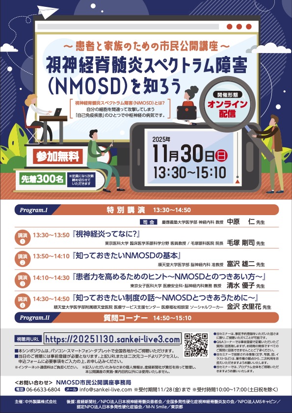 中外製薬株式会社主催【オンライン市民公開講座のご案内】~患者と家族のための市民公開講座~視神経脊髄炎スペクトラム障害(NMOSD)を知ろう専門の先生方から「NMOSDとは何か」「NMOSDの基本やつきあい方」「知っておきたい制度」などをわかりやすくお話してくださる、興味深い内容のプログラム!日時:2025年11月30日(日)13:30〜15:10開催方法:オンライン配信(事前登録制)定員:先着300名(参加無料)事前ご登録はコチラから